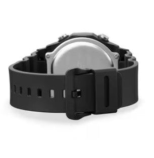 - Band Material: Black resin band with a buckle clasp.