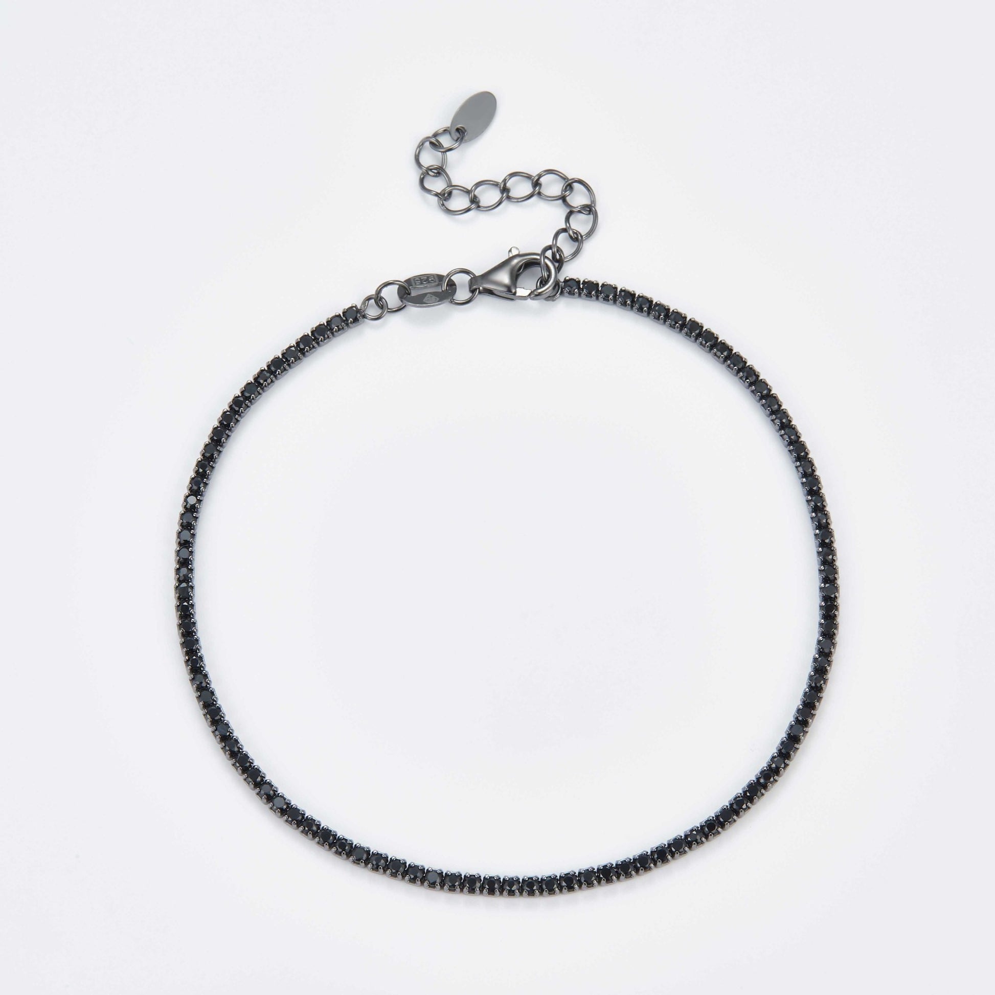 This elegant and dainty bracelet is crafted from Silver 925 and is adorned with 1.5mm Black Zirconias, adding a touch of sparkle to your everyday style. Finished with sleek Black Rhodium Plating for a modern and sophisticated look, this bracelet measures 18mm in length and includes additional extension hoops, offering a customizable fit for comfort and versatility. Perfect for layering or wearing solo, this piece exudes understated elegance and timeless charm.